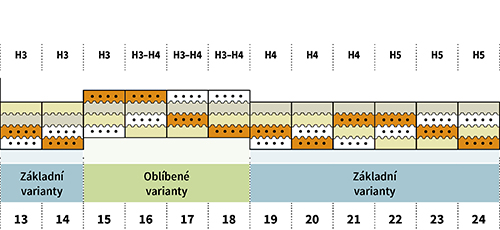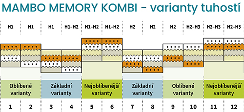 Jak vidíte v tabulce, nejoblíbenější varianty sestavení matrace jsou čtyři a u všech se počítá s použitím obou vrstev paměťové pěny v horní části. Dalších osm oblíbených variant pak počítá s použitím alespoň jedné vrstvy paměťové pěny.