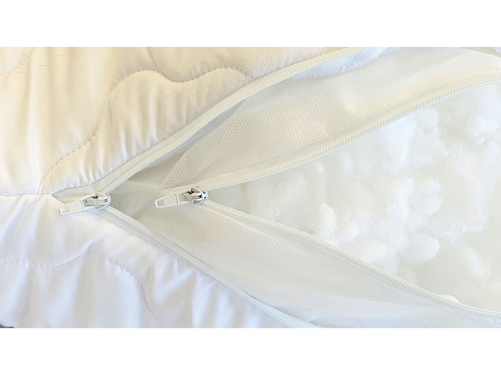 Polštář se skládá z vnější rozepínací vrchní látky Microfibre s hmotností vnitřního rouna 150g/m2, pratelné na 60°C a z vnitřní rozepínací kapsy z netkané textilie pro možnost ubírání nebo doplňování polyesterových výplňových kuliček. Díky tomuto praktickému provedení je možné vyprat jen vnější část polštáře.
