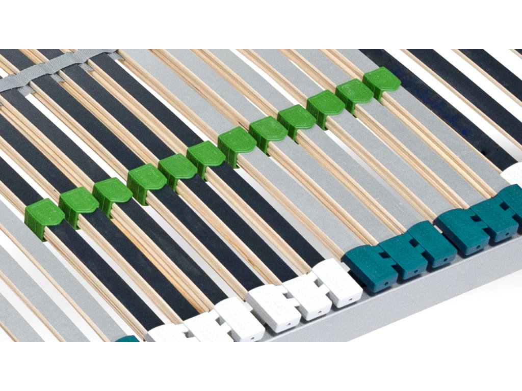 12 zdvojených lamel s posuvnými opasky umožňují regulovat tuhost a tím i tlak vytvářený na matraci v bederní oblasti. Posunutím opasků lze matraci buď více přitvrdit nebo více vyměkčit.