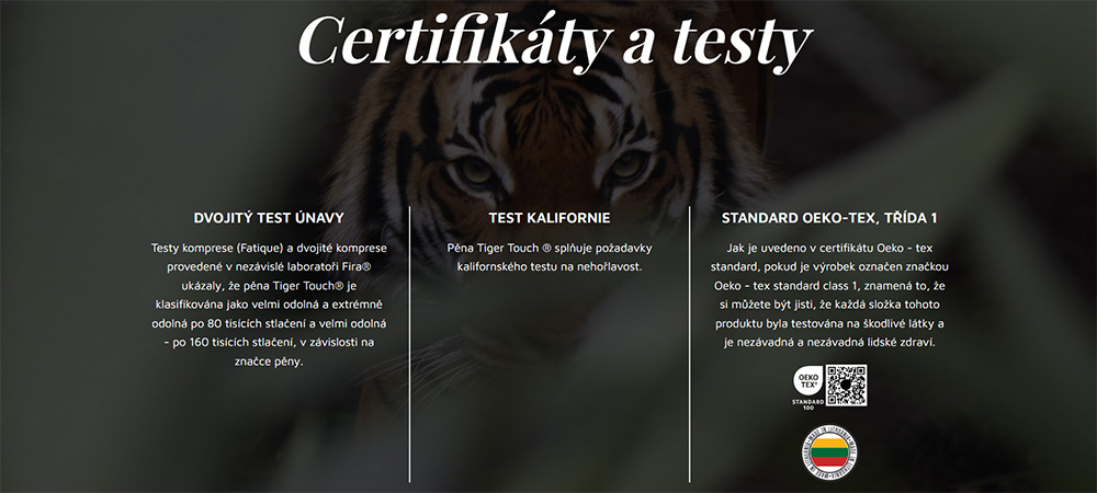 Speciální studená pěna TIGER TOUCH®. Litevský výrobce VITA BALTIC® využil při její výrobě znalostí a dovedností nashromážděných za mnoho let v oblasti výroby pěny k vytvoření pěny mimořádné kvality, která zajišťuje maximální pohodlí a vyznačuje se vysokou odolností. Jako zdroj inspirace si zvolil exkluzivní zvíře, které symbolizuje luxus – tygra. Inspirován charakterem tohoto královského zvířete vytvořil vysoce kvalitní pěnu, která má stejné vlastnosti jako tvor, který ho inspiroval: odolnost, pružnost, měkkost a maximální pohodlí. Je to nejlepší pěnový produkt na bázi MDI pro trh matrací a komerčního nábytku, protože jeho hlavní vlastnosti a dostatečná úroveň pohodlí jsou zachovány po výrazně delší dobu než běžné studené pěny.