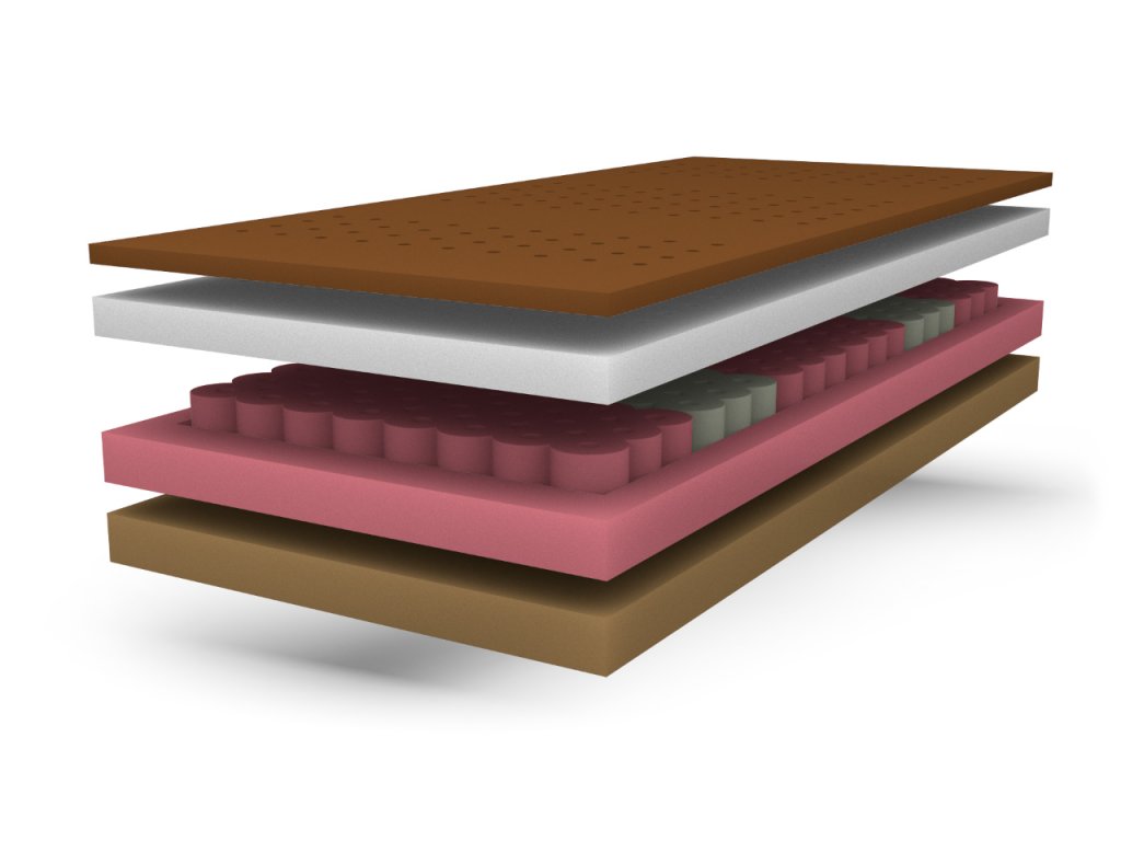 Jádro matrace tvoří vynikající děrovaná značková belgická paměťová pěna CARPENTER® o obrovské objemové hmotnosti 85 kg/m³ a děrovaná německá studená pěna CARPENTER® o vysoké objemové hmotnosti 50 kg/m³. Horní vyměkčovací vrstvou je děrovaná exkluzivní značková německá studená pěna XDURA® od EUROFOAME® o vysoké objemové hmotnosti 50 kg/m³. Uvnitř matrace je použitý unikátní systém vysekávaných segmentů ze studené pěny, s vysokou objemovou hmotností až 60 kg/m³, které jsou nosnou i tvarovací částí matrace a zároveň zajišťují perfektní prodyšnost.